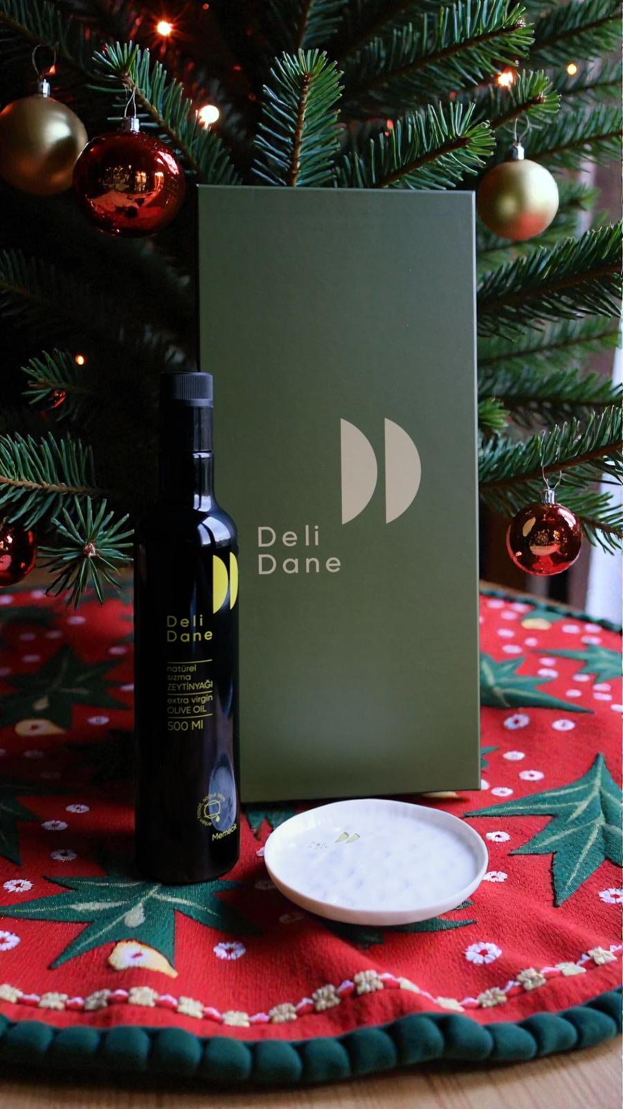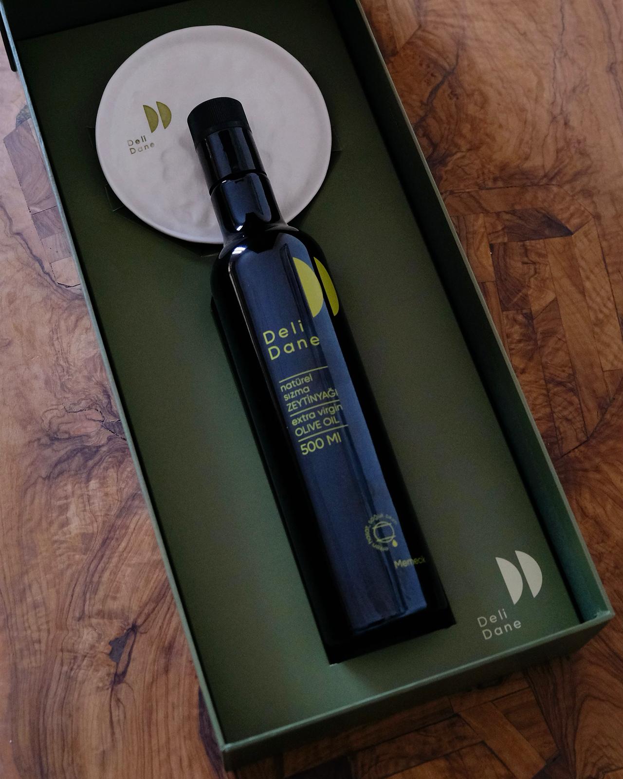 1 adet 500 ml 2025 hasat memecik zeytinyağı ve el yapımı porselen tabak bu kutunun içinde.